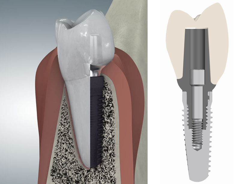 Zahnärztliche Implantate sind heute aus der modernen Zahnheilkunde nicht mehr wegzudenken. Es ist eine seit Jahrzehnten bewährte Methode, Zähne, die durch Unfall oder Krankheit verloren gingen, zu ersetzen. Zahnimplantate stellen dabei die natürliche Zahnwurzel dar – in Form und Funktion. Der Kieferknochen wächst fest an das Zahnimplantat an, so dass darauf eine neue, individuell angefertigte Zahnkrone, vom Zahntechniker hergestellt, befestigt werden kann. Diese Technik orientiert sich an der Perfektion der Natur. Genialer Nebeneffekt hierbei: Das Zahnimplantat trainiert den Kieferknochen, das heißt er wird natürlich belastet und trägt damit entscheidend zum langfristigen Erhalt des Kieferknochens bei. Darüber hinaus trägt ein Zahnimplantat genau die zu ersetzende Zahnkrone – die Lücke ist geschlossen. Ein Beschleifen der Nachbarzähne, wie bei herkömmlichen Brücken üblich, ist bei dieser Methode nicht nötig. Die wertvolle, natürliche Zahnsubstanz bleibt unberührt.